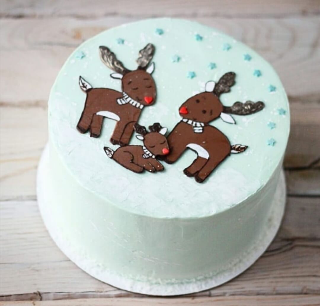 Милое семейство северных оленей украшает зимний предновогодний тортик