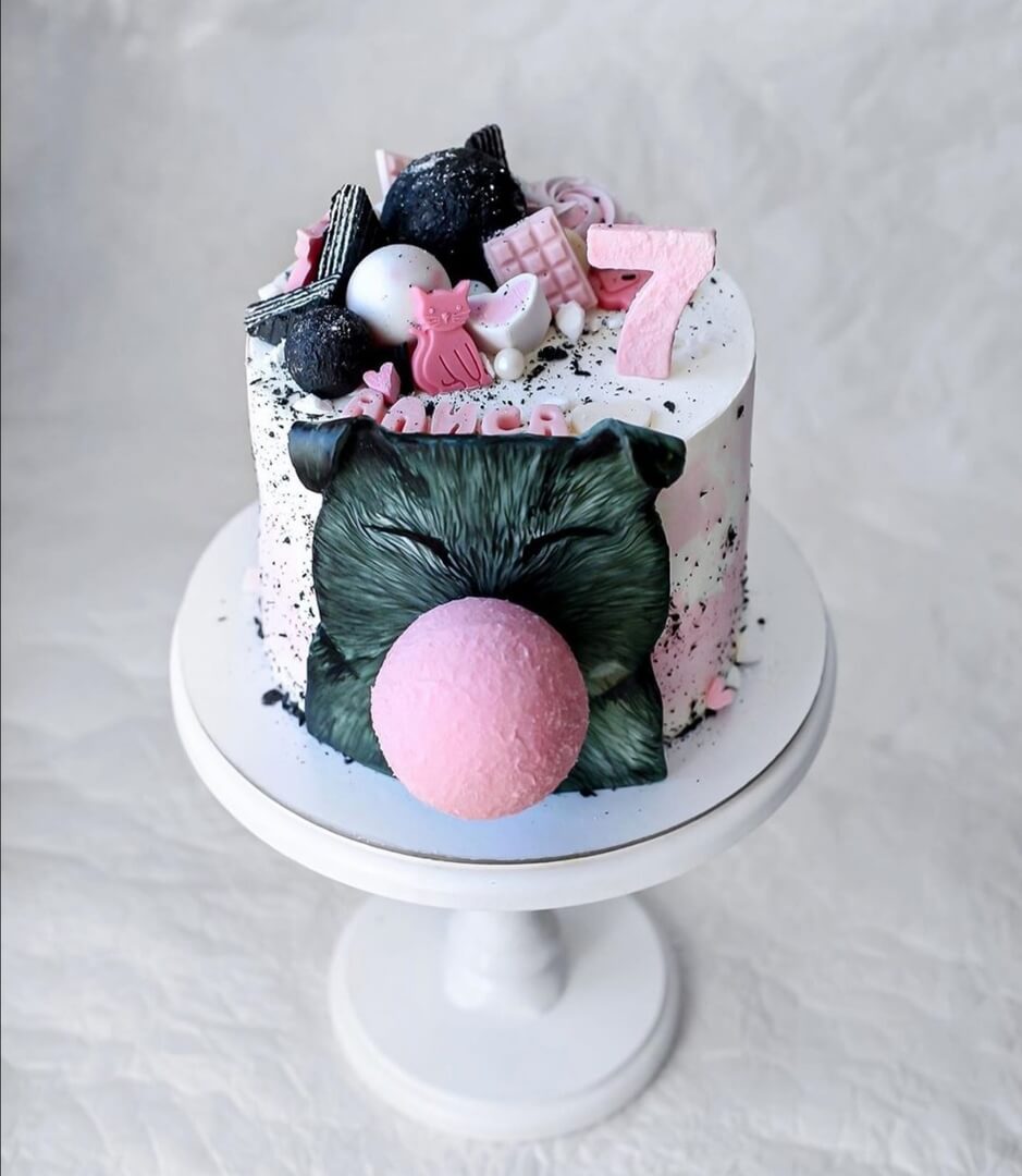 Яркие розовые шары из жвачки, котики и сладости - в этом тортике отражены самые любимые вещи юной хулиганки