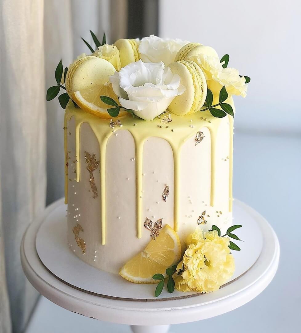 Свежий лимонный тортик, украшенный дольками цитруса, нежными цветами и ароматными макарунами
